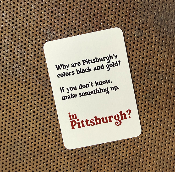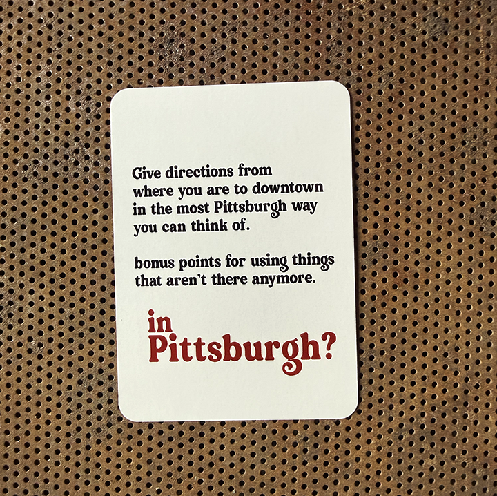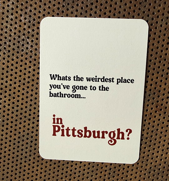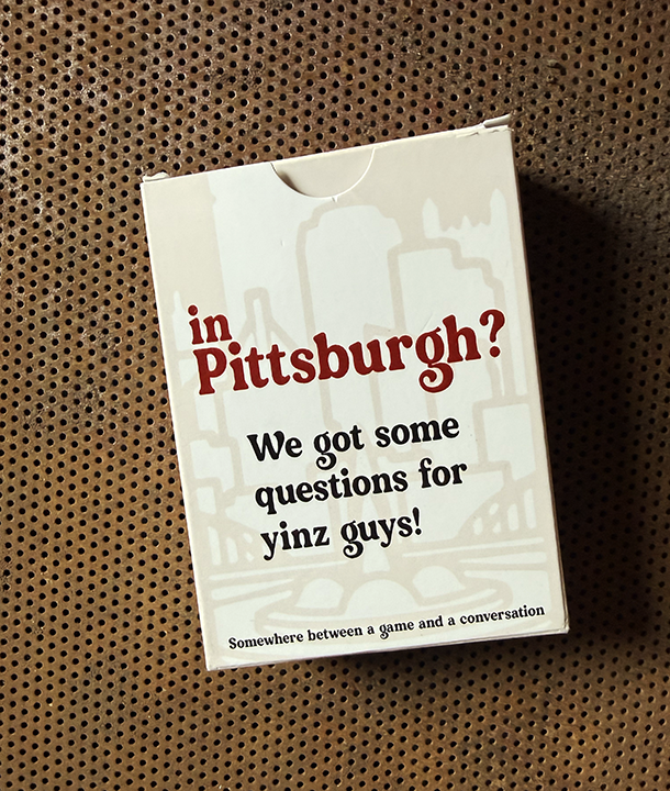 In Pittsburgh - conversation starting game of questions. this is a good time in a box. theres really no rules, just pull a card and...